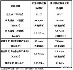 接枝改性功能料在热熔胶中应用很多,能改善热熔胶体的相容性,提升对不同基材的粘接性能,改善胶体强度。下面介绍一下改性功能料应用于管道防腐热熔胶的有益影响。